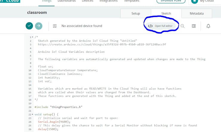 In order to easily connect the device to arduino Cloud platform I will be fully using the Web Editor for this project. Make you already install the arduino create agent to be able to connect the esp32 to the web editor. Open the Sketch then click on the open full editor button