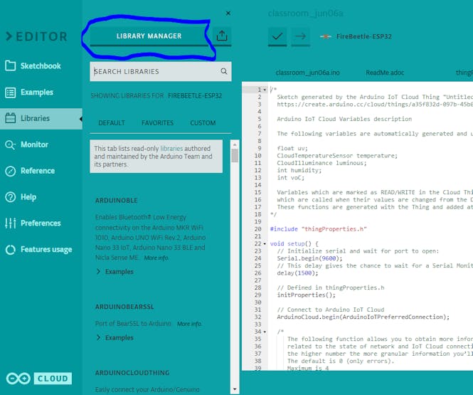 in order to able to use the Fermion multifunctional Environment sensor and SGP40 I need to add the libraries. Go to libaries menu and click the libray manager button