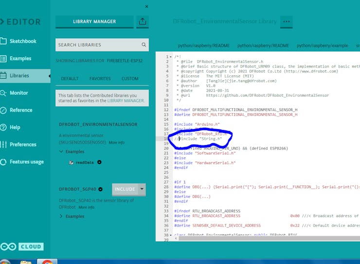 In order to use it, The Fermion multifunctional Environment sensor need additional library called the Dfrobot RTU, grab the library here then add it to the web editor