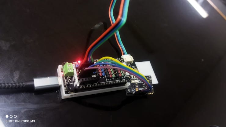Grab the Gravity: IO Shield for FireBeetle 2 and plug it in on top of the firebeetle 2. Then Connect the sensors using the I2C line on the IO shield. Then you will have something like this