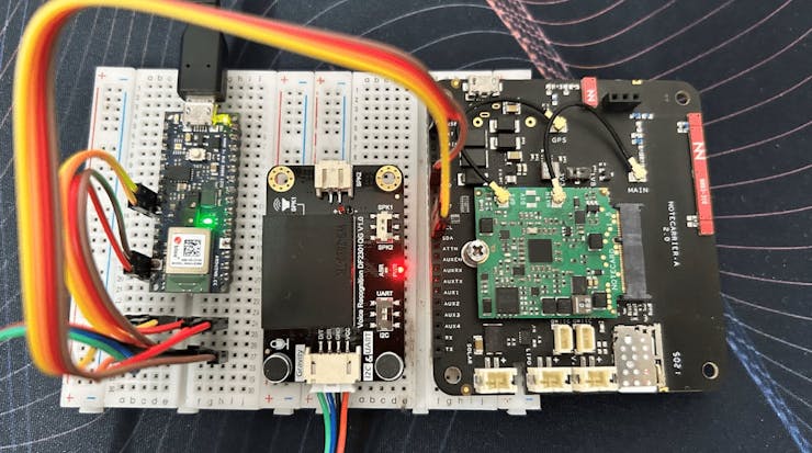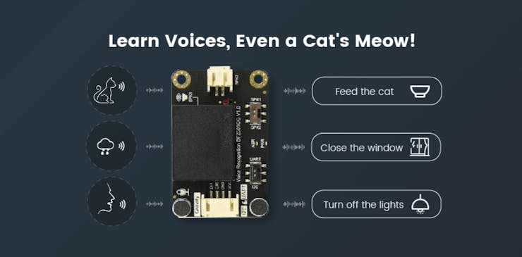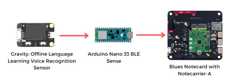 For this project, we are going to use the DFRobot's Gravity Offline Voice Recognization module. This module can classify custom voice commands without the internet. We can connect this Voice Recognition module with an Arduino Nano 33 BLE sense. Finally, our Blues Notecard can transfer the voice classification data to the Blues Notehub. And then from Notehub, we can route the data as we need to any other cloud service!