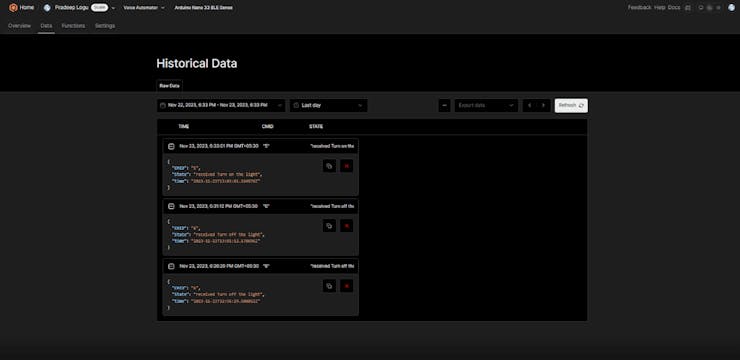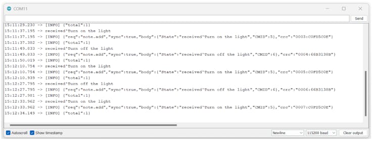 Based on our voice command, the Blues Notecard will send a different payload to the cloud.