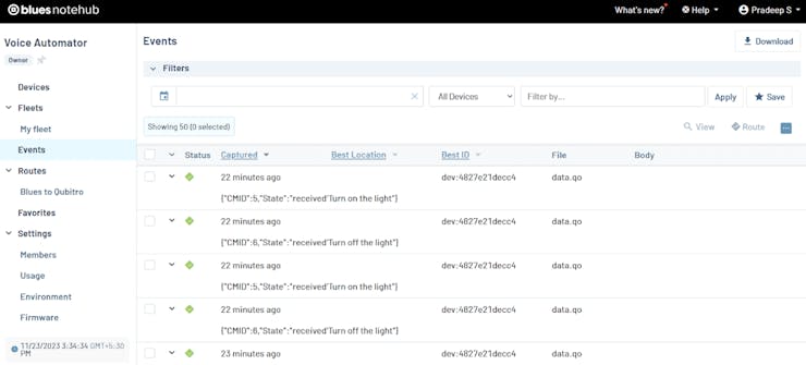 Now we can see all our voice sensor data in the Blues Notehub.