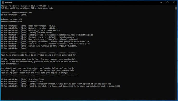 In this message, you can see the IP address with the port number. In my case it is http://127.0.0.1:1880. Enter this local IP address in the LattePanda's browser. It will open the Node-RED dashboard: