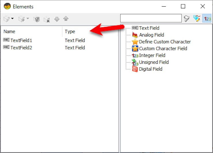 - In the "Elements" window drag another "Text Field" to the Left side and in the properties window set "Width" to 20 and "Row" to 1