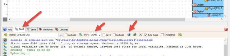 In Visuino, at the bottom click on the "Build" Tab, make sure the correct port is selected, then click on the "Compile/Build and Upload" button.