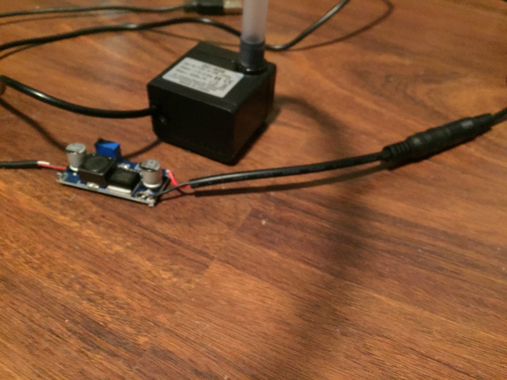 The pump comes with a standard plug with exposed wires at the end. Solder these wires to a boost converter as our default voltage of 5 volts won't cut it. We'll be using the booster to get 11vdc from our batteries. On the other side, solder a USB cable. Use the potentiometer to set the output voltage to about 11 volts. The pump is rate for 6v-12v, but I decided to stay safe with 11 and also not burden the boost converter too much as it has no extra heat sink. Test your electronics by connecting the pump and submerging it in water. It should be on.