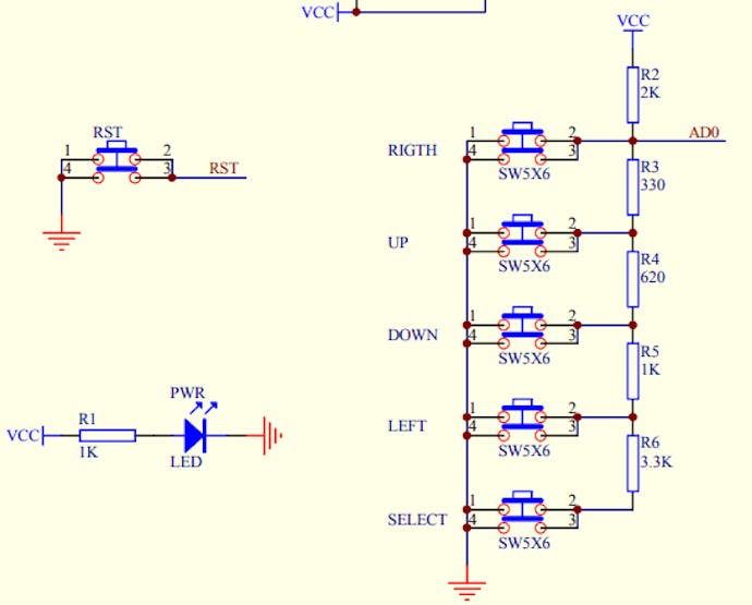 Look at the schematic and you see the reset that restarts the board and you see a ladder of resistances connecting to Analog Input 0. The voltage going to A0 depends upon which buttons are pressed.