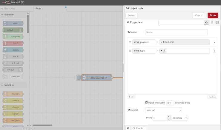 Name: Every 10 secondsRepeat: intervalEvery: 10 secondsThis will make the node send a timestamp message every 10 seconds.