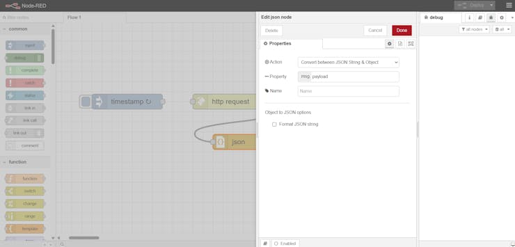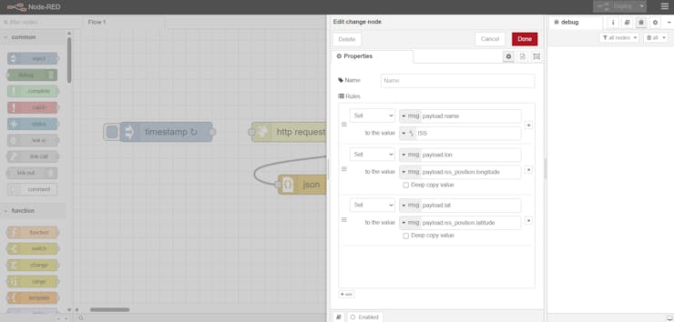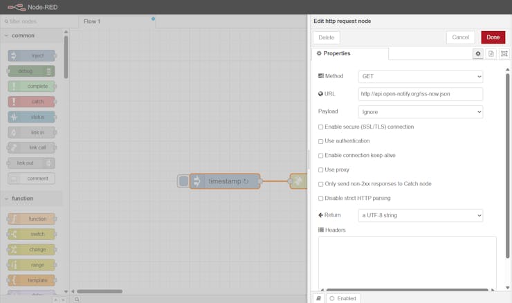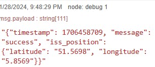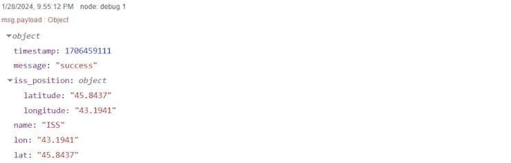 The ISS location node is used to query the ISS location API and return the current latitude and longitude of the ISS. To configure it, double-click on it and set the following properties: