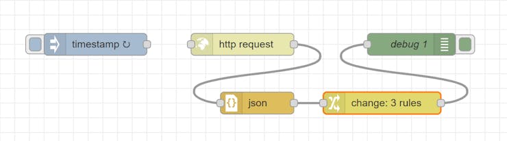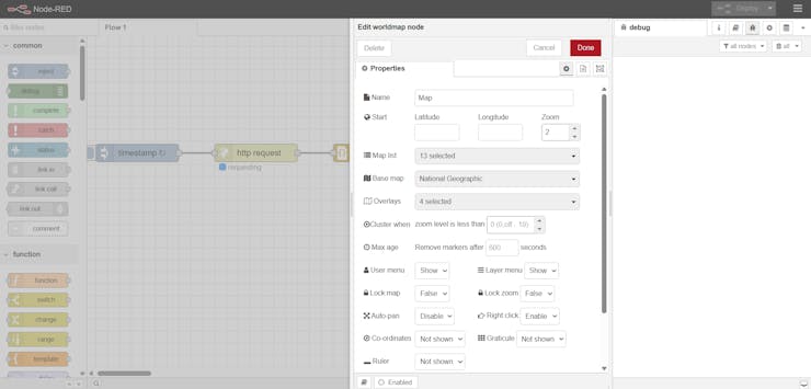 An inject node that triggers the flow every 10 seconds.An HTTP-request node that queries the ISS location API and returns the current latitude and longitude of the ISS.A function node that formats the location data into a message object that the world map node can use.A worldmap node that displays a world map and a marker for the ISS location.The flow looks like this: