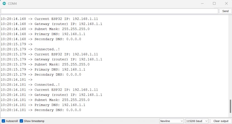 Open the Serial Monitor and set the baud rate to 115200. Then, press the EN button on the ESP32 board. It may take a few moments to connect to your network, after which it will print the current network settings of the ESP32 board to the serial monitor. Take note of these settings, especially the IP address, gateway, subnet mask, and DNS servers.