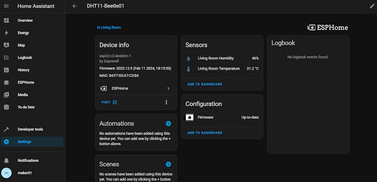 And thatās it! Youāve successfully integrated the DHT11 sensor with your Beetle ESP32 C3 and Home Assistant. Feel free to customize and expand this project based on your needs. Happy monitoring! ?ļø??