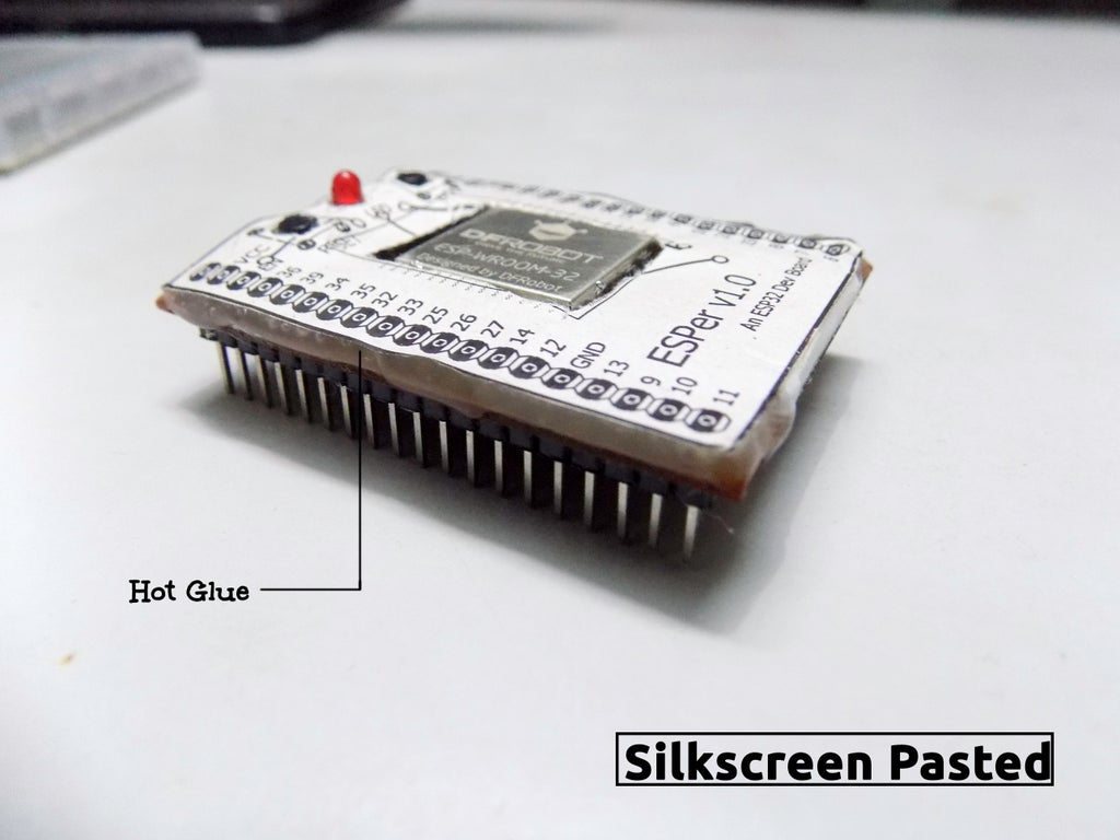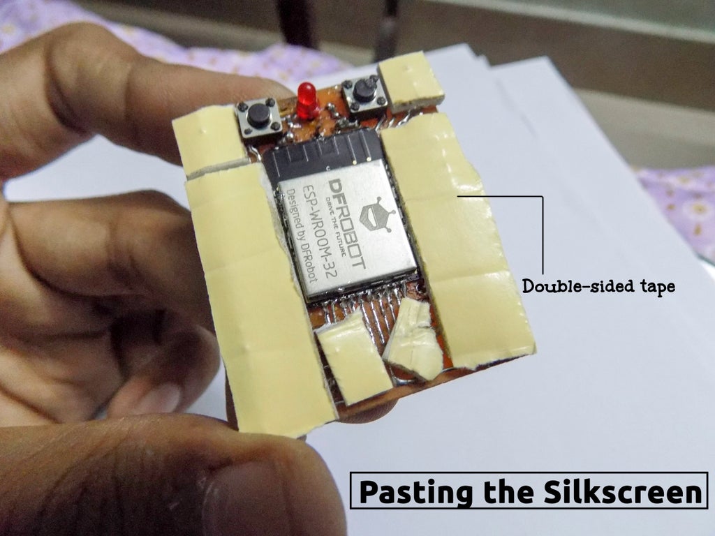 Now our ESPer is completely functional but it still lacks something, and that is a silkscreen. Adding this silkscreen will rid us of continuous referring to pinouts. To stick it to the board, I'll be using double-sided tape. The silkscreen can be attained through the layout printed earlier.