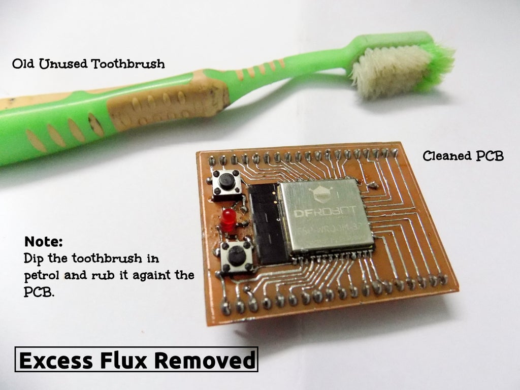 After soldering all the components carefully and correctly, clean the whole PCB by using an old toothbrush(also useless). This removes all the excess flux.