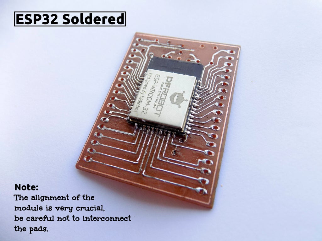 - While soldering the ESP32 module, solder the diagonal pads first so that the chip doesn't mess up its alignment.