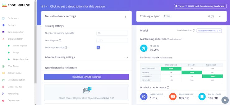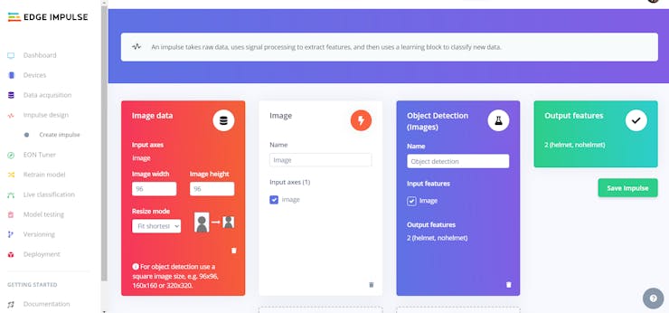 I went to the labeling queue. I created an Impulse for Image data using96x96px, Image processing block, Object Detection as learning block and 2 output features: helmet and nohelmet.