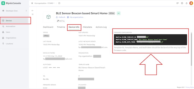 - Once you add the device, you will get Template ID, Template Name and Auth Token. (You will need these to add these in final code of the project)- Copy it and paste(/Declare) it at the very top of the firmware code.Ā