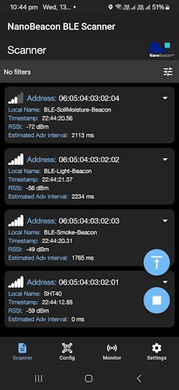 - Then as per instructions given in WiKi pageof BLE Sensor Beacon, we configured BLE beacon data acquisition and broadcast parameters using NanoBeaconConfigTool.Ā - We checked for all Sensor beacons broadcast. By using Mobile Appļ¼NanoBeacon BLE Scanner(IOS/Android)Ā