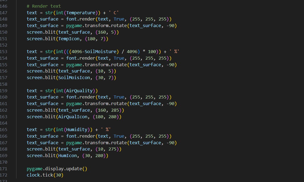 5. Finally, I rendered the text and icons on the screen with pygame. I assigned coordinates to each icon to make each one take up one corner of the screen.