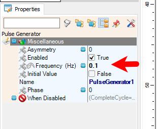 Select "PulseGenerator1" and in the properties window set "Frequency" to 0.1