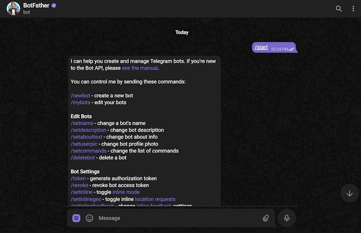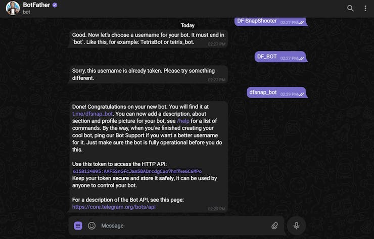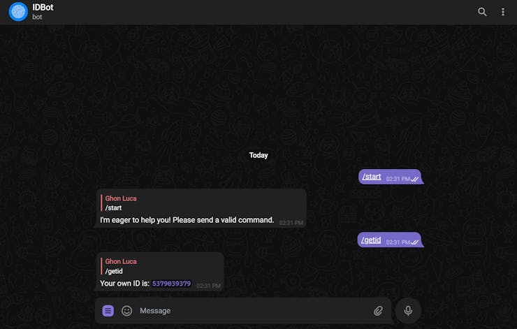 Anyone that knows your bot username can interact with it. To make sure that we ignore messages that are not from our Telegram account (or any authorized users), you can get your Telegram User ID.