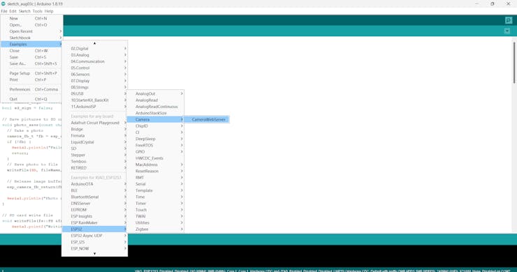 Ā Ā Ā Ā Open Arduino IDE and go to examples and ESP32 CAM then Camera Web Server: Just replace the complete ino file with the following code