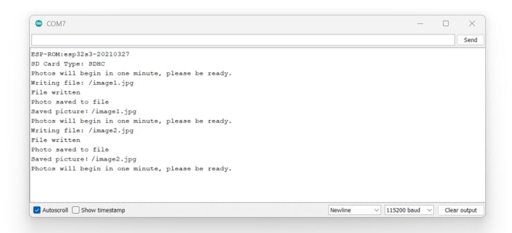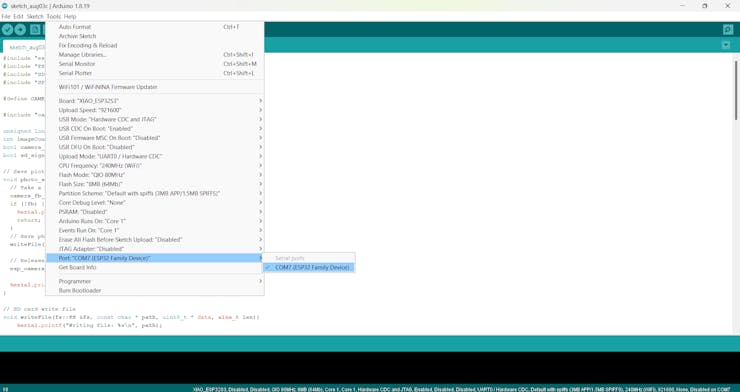 Upload the Code: Connect your Xiao ESP32 S3 Sense to your computer, Select the correct COM port, and upload the code using the Arduino IDE.Ā Test the Camera: Once the code is uploaded, the camera will start capturing images at regular intervals and saving them to the MicroSD card. You can open the serial terminal and look for the response.Ā