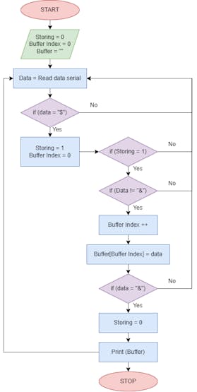 Meanwhile, on the SURF5 Board, we will make modifications as shown in the block diagram below. In the program loop, we will place the code to read serial data as usual. When the character "$" is detected, a flag will be activated to start the data storing process. Data will begin to be stored until the character "&" is detected, which will act as a flag to end the data storing process. The data will be stored in a buffer variable, which we can then use in its entirety.