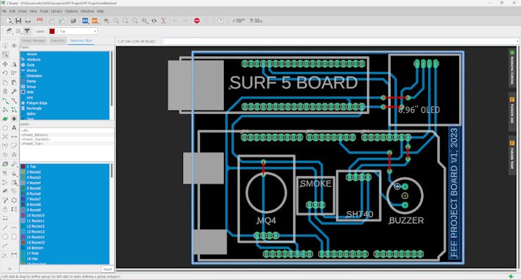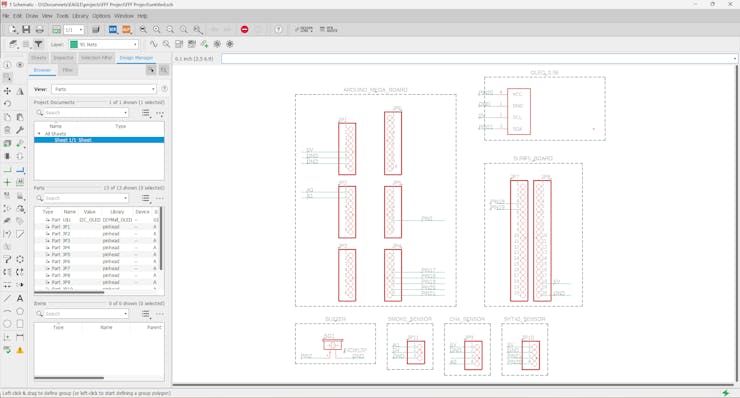 In developing this project, I decided to create a custom PCB to facilitate the device implementation process. This process begins with using Eagle, a PCB design software renowned for its efficiency in laying out electronic circuitry. The first stage involves designing the schematic, where I craft detailed circuit diagrams. To support this process, I've had to manually measure the SURF5 board I'm using due to the unavailability of a suitable library.