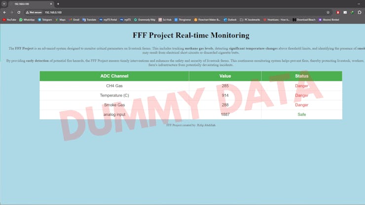 We need to implement serious preventive measures to address this issue. To tackle this problem, the FFF Project has been developed. The FFF Project is a system designed to monitor methane gas levels, significant temperature changes above threshold limits, and the presence of smoke that may arise from electrical short circuits or discarded cigarette butts. This comprehensive monitoring system aims to provide early detection of potential fire hazards, ensuring timely interventions and enhancing the safety and security of livestock farms. By continuously tracking these critical parameters, the FFF Project helps prevent fires, thereby protecting livestock, workers, and the farm's infrastructure from potentially devastating incidents.