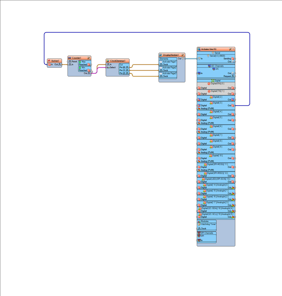 Connect Arduino digital pin [2] to "Button1" pin [In]Connect "Button1" pin [Out] to "Counter1" pin [In]Connect "Counter1" pin [Out] to "ClockDemmux1" pin [In]Connect "ClockDemmux1" pin [0] to "DisplayNextion1" > "Activate Page1" pin [Clock]Connect "ClockDemmux1" pin [1] to "DisplayNextion1" > "Activate Page2" pin [Clock]Connect "ClockDemmux1" pin [2] to "DisplayNextion1" > "Activate Page3" pin [Clock]Connect "DisplayNextion1" pin [Out] to Arduino serial pin [In]