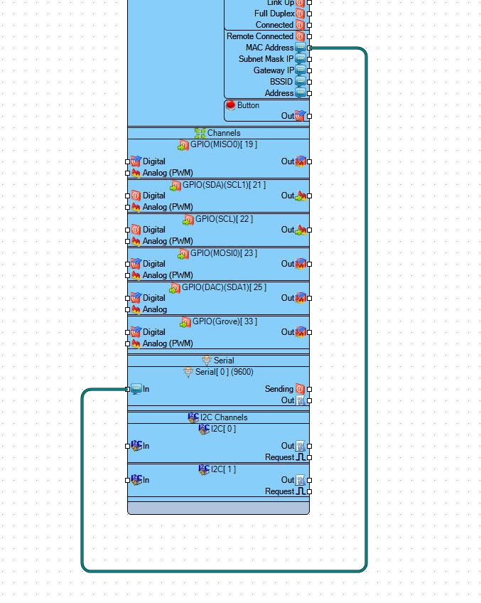 Connect "M5 Stack ATOM Matrix" > "Sending" Pin [Out] to "SplitStructure1" Pin [In]Connect "SplitStructure1" > "Digital1" Pin [Out] to "MultiSource1" Pin [In]Connect "MultiSource1" Pin [0] to "UpDownCounter1" Pin [Reset]Connect "MultiSource1" Pin [1] to "TFlipFlop1" Pin [Set]Connect "TFlipFlop1" pin [Out] to "PulseGenerator1" Pin [Enabled]Connect "PulseGenerator1" Pin [Out] to "UpDownCounter1" Pin [Down]Connect "UpDownCounter1" Pin [Min Reached] to "TFlipFlop1" pin [Reset]Connect "UpDownCounter1" Pin [Out] to "IntegerMultiSource1" Pin [In]Connect "IntegerMultiSource1" Pin [0] M5 Stack ATOM Matrix > "Fill Screen1" Pin [Clock]Connect "IntegerMultiSource1" Pin [1] M5 Stack ATOM Matrix > "Text Field1" Pin [In]Connect "IntegerMultiSource1" Pin [2] M5 Stack ATOM Matrix > "Text Field1" Pin [Clock]