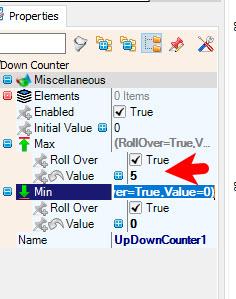 Select "UpDownCounter1" and in the properties window set "Max" > "Value" to 5 < Connect Arduino digital pin [2] to "Button1" pin [In]Connect "Button1" pin [Out] to "UpDownCounter1" pin [Up]Connect "UpDownCounter1" Pin [Out] to "IntegerToAnalog1"Connect ""IntegerToAnalog1" pin [Out] to Arduino Analog PWM pin [3] Upload the project like described in the step "Generate, Compile, and Upload the Arduino Code"