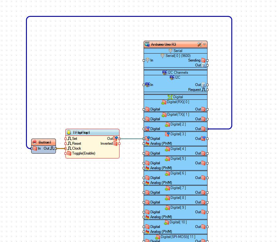 Connect Arduino digital pin [2] to "Button1" pin [In]Connect "Button1" pin [Out] to "TFlipFlop1" pin [Clock]Connect "TFlipFlop1" pin [Out] to "PulseGenerator1" pin [Enabled]Connect "PulseGenerator1" pin [Out] Arduino digital pin [3]