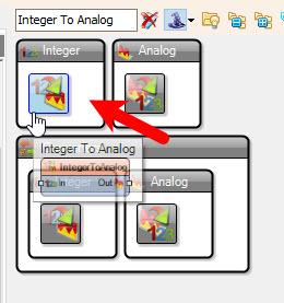 Select "DetectEdge1" and in the properties window set "On Rising/True" to FalseDouble click on the "AnalogValue1" and in the Elements window drag "Set Value" to the left side and in the properties window set "Value" to 1Drag another "Set Value" to the left side and close the Elements windowSelect "RampToValue1" and in the properties window set "Slope (Sec)" to 0.5