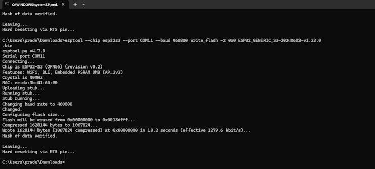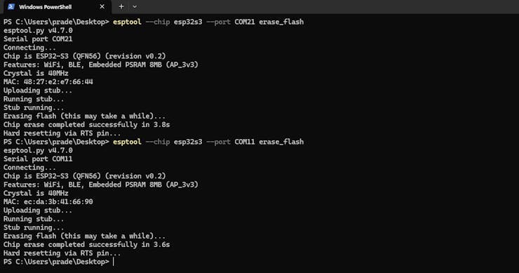 3. Erase existing firmware on the XIAO ESP32-S3 by connecting it to your PC and running the following command: