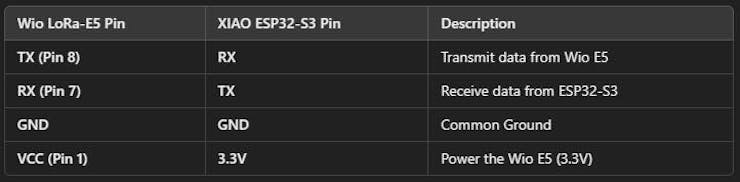 Hereâs how you can connect the **XIAO ESP32-S3** to the **Wio LoRa-E5** module using UART: