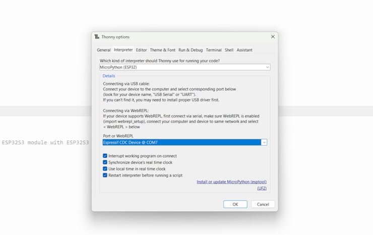 3. Plug in your XIAO ESP32-S3, and in Thonny, go to Tools > Options > Interpreter, then select the correct Port corresponding to your device (e.g., `COM3` on Windows or `/dev/ttyUSB0` on Linux).