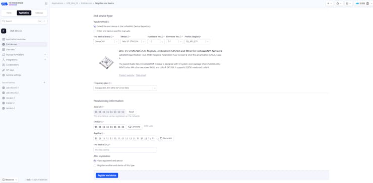 1. Under your application, click Devices â Register end device.