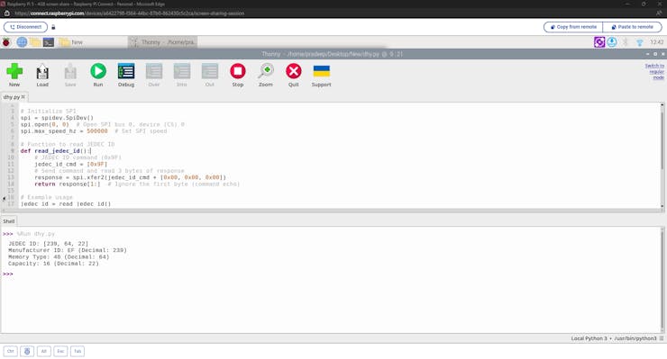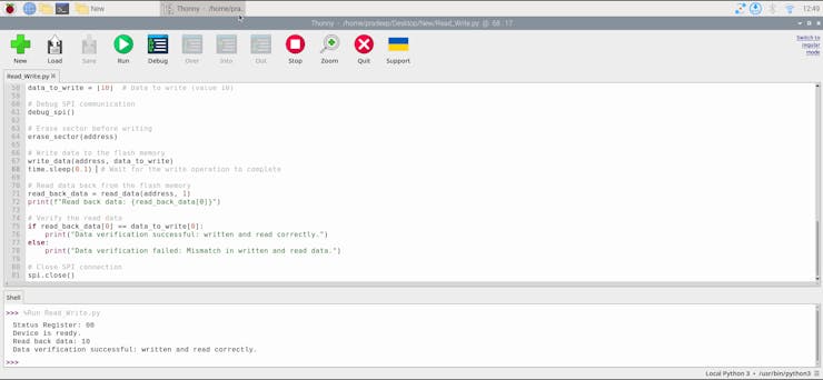 This project successfully demonstrated the seamless integration of a W25Q32 flash memory chip with a Raspberry Pi 5 using the SPI protocol and Python programming. By leveraging the SPI interface and the spidev library, we were able to establish reliable communication between the Raspberry Pi and the memory chip, enabling efficient data storage and retrieval.