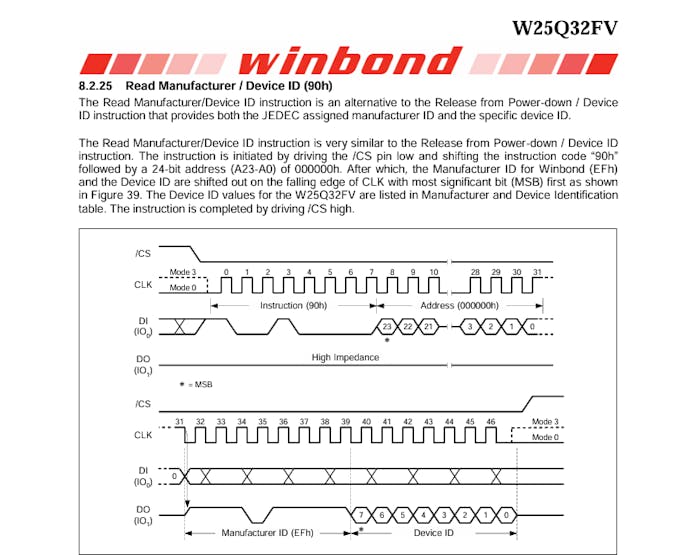 All the Winbond devices have a dedicated manufacturer ID inside the chip. First, we need to test our connection. Let's read the Device ID and we can verify the connection.