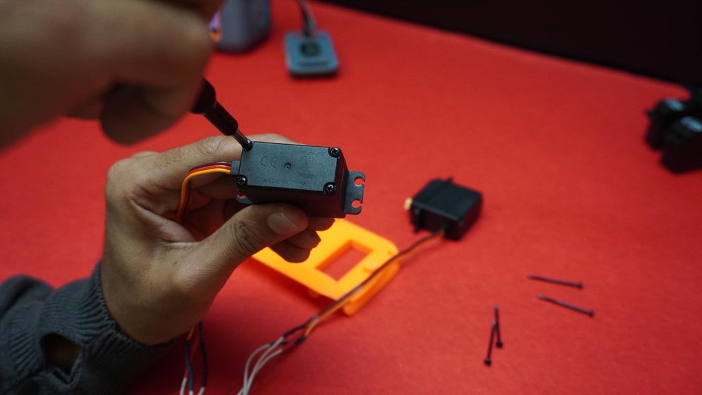 Remove the screws holding the bottom cover of each servo motor using a screwdriver.Carefully separate the bottom part of the servo motors.Place the bottom part of the servo motor housing into the slot in the main body first.Align the servo motor with the slot and gently position it|Once the servo motor is positioned correctly, reattach the bottom part to the servo motor.Tighten the screws you removed earlier to close the servo housing securely.Use the M2 screws provided in the servo pack to attach the servo motor to the main body.