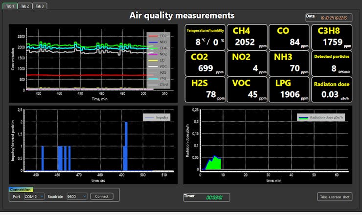 In general, our device is capable of measuring various pollutants, including CO2, CO, CH4, LPG, C3H8, NO2, NH3, H2S, volatile organic compounds, and radiation levels using an Arduino Geiger counter kit.