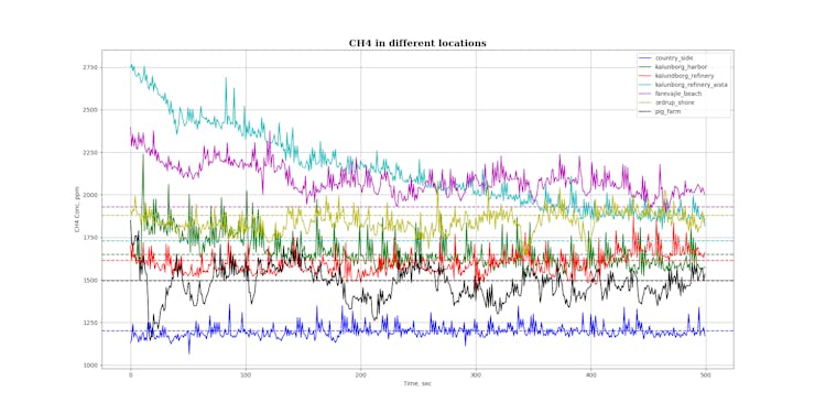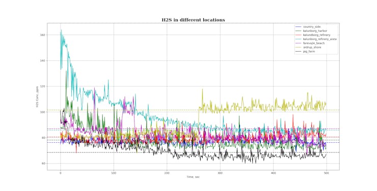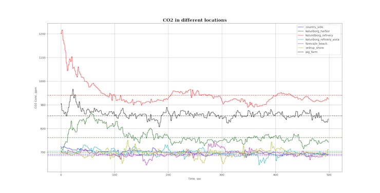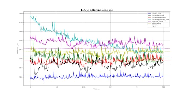 4. As expected, the chemical plant leaves traces of its presence in the environment, as it's difficult to completely seal and isolate such a large-scale chemical production facility. Paying attention to the plot above, it is visible, that CO2 level is higher for 250 ppm then in rural area, it is approx 20%, that same about harbor area. Winds are spreading CO2 cloud to the town. About hydrocarbon gases, they are volatile, being lighter then air, presence of it less visible in Kalundborg town. However, overall, to state about exceeding concentration levels with MQ sensors data would be not right due to doubting quality and detection range, rightly would be to declare the concentration difference among several location. I guess, manufacturer stated detection range was inaccurate due to translation errors, and real gas concentration is 1000 times lower and relevant concentration is in ppb (particle per billion) units.