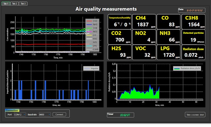 As previously mentioned, our software collects data and stores it on the laptop's hard drive as JSON data sets in TXT files. These data sets (approximately 8000 data rows overall) can be processed using Python Pandas, allowing for the creation of plots for each location and subsequent comparisons.In few steps with manipulation with python pandas we have processed data and generated plots for pollutants and radiation level in current areas.