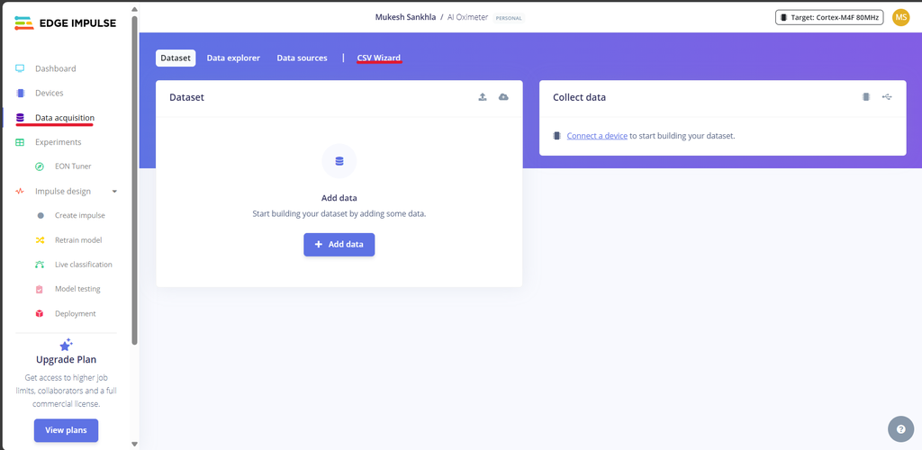 The Data Acquisition panel in Edge Impulse allows you to upload data, collect data from a connected device, and manage your datasets.