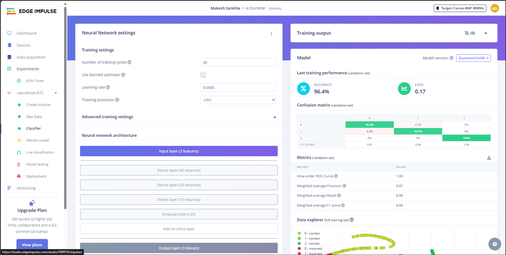 This project demonstrates the successful integration of Edge Impulse's AI capabilities with real-time sensor data to build an AI-powered oximeter. By leveraging the MAX30102 sensor, ST7789 TFT display, and a custom-trained Edge Impulse model, we have created a compact and efficient device capable of monitoring vital health parameters such as SpO2, heart rate, and body temperature. The addition of AI-based classification enhances the oximeter's functionality by providing an intuitive assessment of the user's health status (Good, Bad, or Sick) based on real-time data.