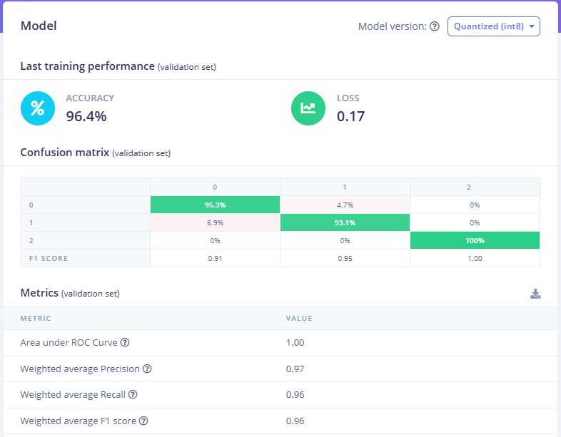 96.4% overall accuracyVery low loss (0.17)Perfect F1 score (1.00) for Class 2Strong confusion matrix scores (95.3%, 93.1%, 100% diagonal)