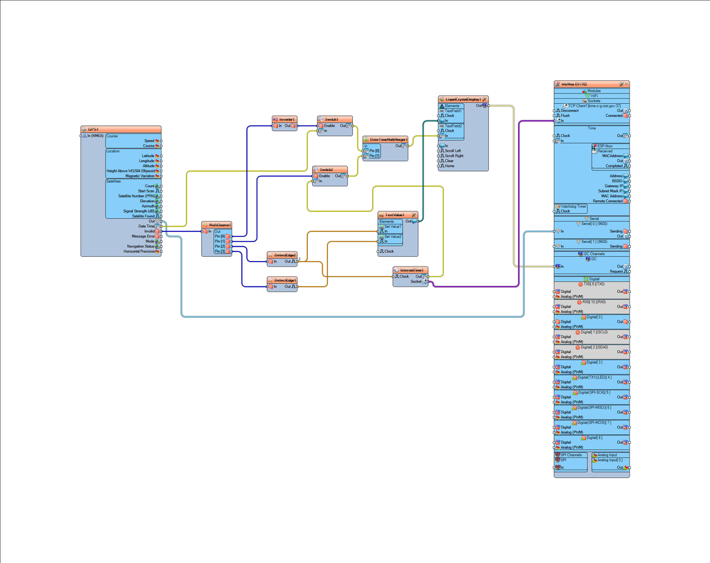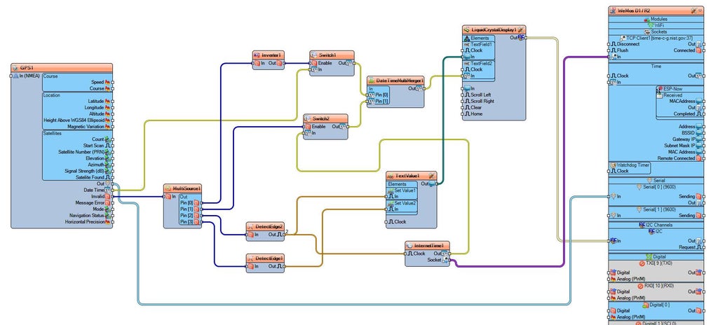 In the properties window Under "SSID" put the name of your WiFi NetworkUnder "Password" put the access password for your WiFi networkClose the "Access points" windowOn the left in editor select Modules>Wifi>Sockets, click on [...] button, so that "Sockets" window will open Drag the TCP/IP Client from right to the left side, then Under Properties window set port: 37 and host: time-c-g.nist.govClose the "Sockets" windowAdd "Serial GPS" componentAdd "Digital Multi Source" component, and in the properties window set "Output Pins" to 4Add "Digital (Boolean) Inverter (Not)" componentAdd 2X "Date/Time On/Off Switch" component and for both in the properties window set "Send On Enable" to TrueAdd 2X "Detect Edge(Digital to Clock)" component and for the first one in the properties window set "On Rising/True" to FalseAdd "Internet Time Protocol" componentAdd "Date/Time Multi-Source Merger" componentAdd "Text Value" componentDouble click on "TextValue1" and in the Elements window drag "Set Value" to the left side and in the properties window set "Value" to Internet Timedrag another "Set Value" to the left side and in the properties window set "Value" to GPS TimeClose the Elements window